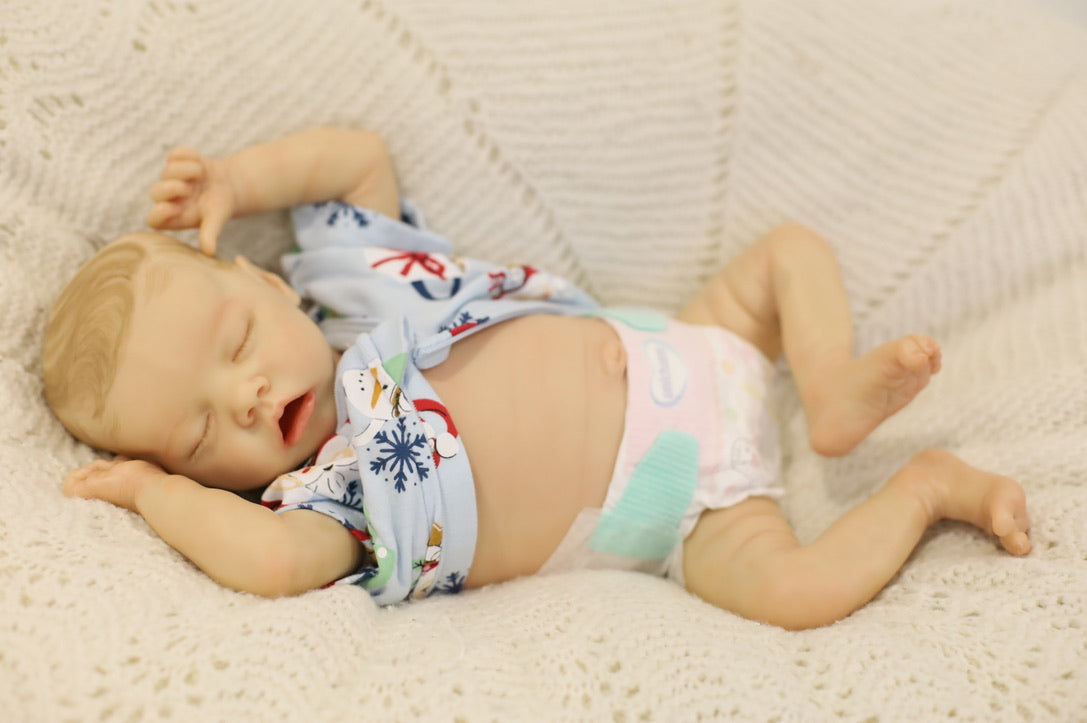 He has been hand painted at Aliyah's Playborn World by our team of talented reborn artists. Many, many layers of paint have brought this precious baby to life, making him look and feel just like a real baby.