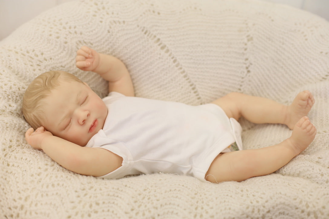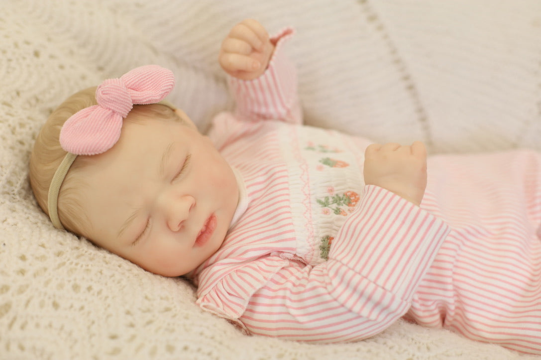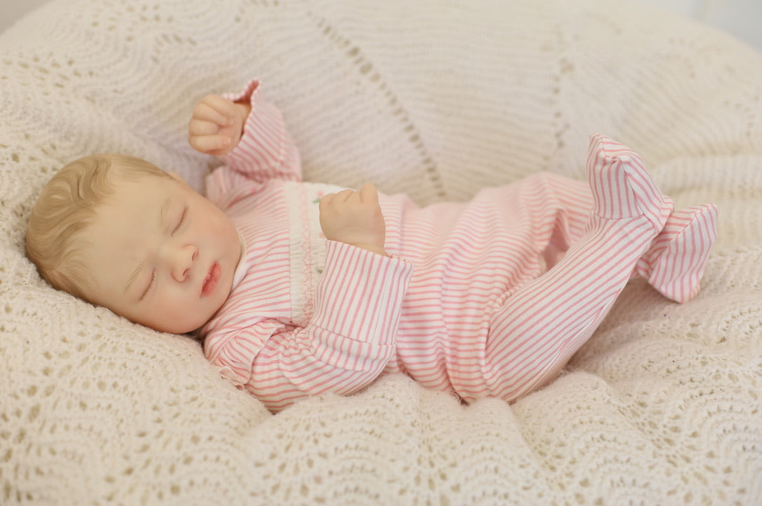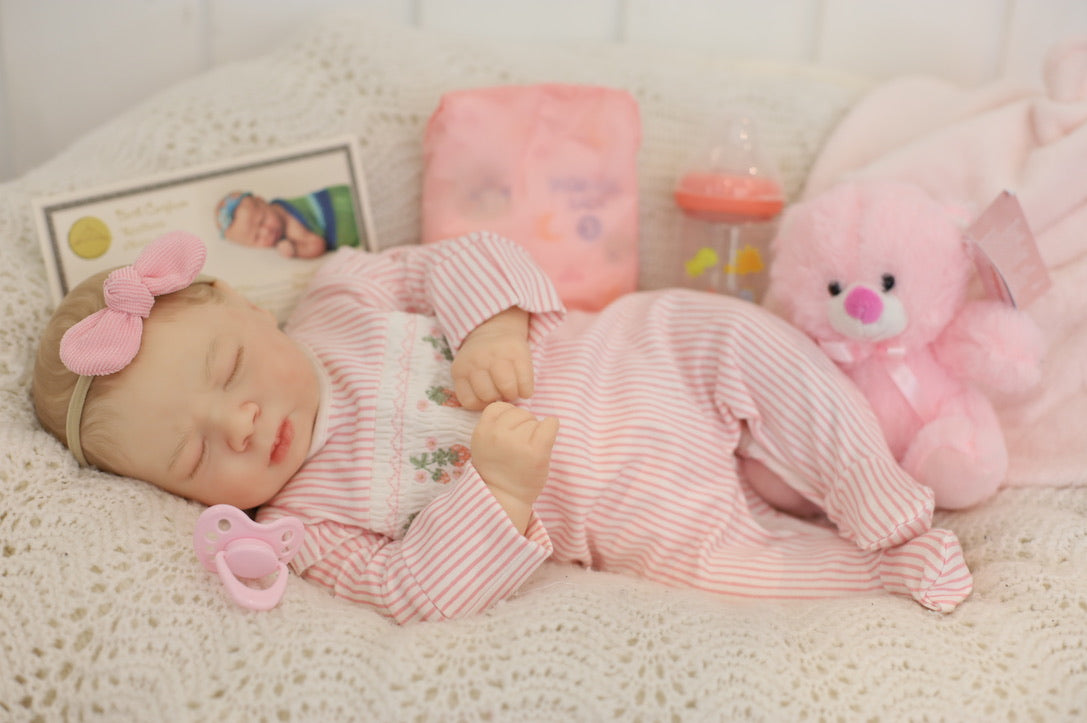 She has been hand painted at Aliyah's Playborn World by our team of talented reborn artists. Many, many layers of paint have brought this precious baby to life, making her look and feel just like a real baby.