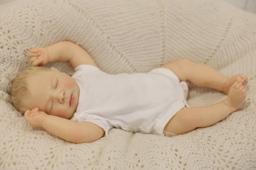 She has been hand painted at Aliyah's Playborn World by our team of talented reborn artists. Many, many layers of paint have brought this precious baby to life, making her look and feel just like a real baby.
