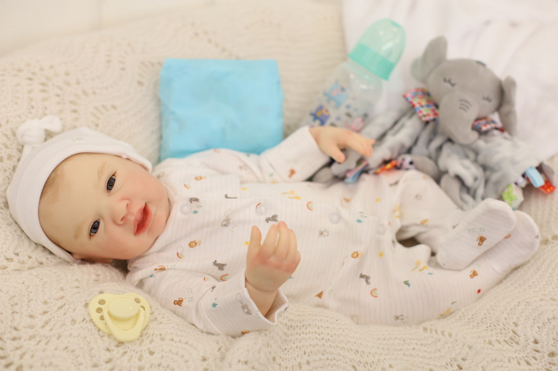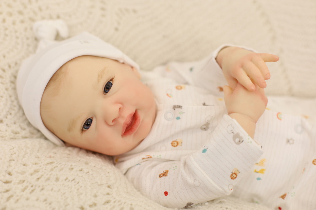 He has been hand painted at Aliyah's Playborn World by our team of talented reborn artists. Many, many layers of paint have brought this precious baby to life, making him look and feel just like a real baby.
