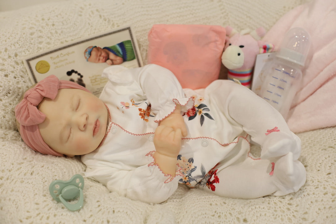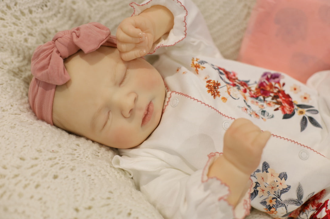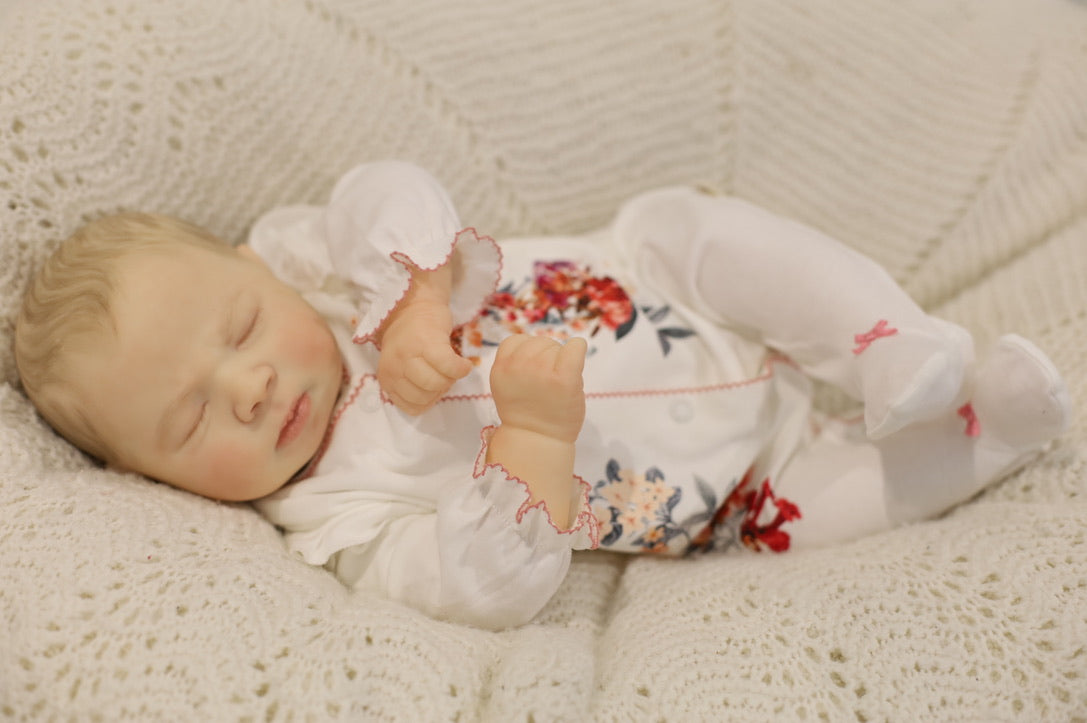 She has been hand painted at Aliyah's Playborn World by our team of talented reborn artists. Many, many layers of paint have brought this precious baby to life, making her look and feel just like a real baby.