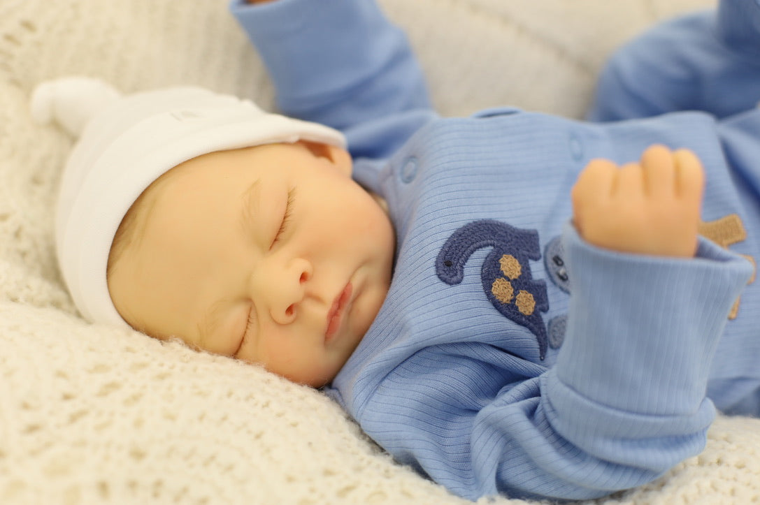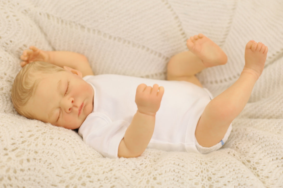 He has been hand painted at Aliyah's Playborn World by our team of talented reborn artists. Many, many layers of paint have brought this precious baby to life, making him look and feel just like a real baby.