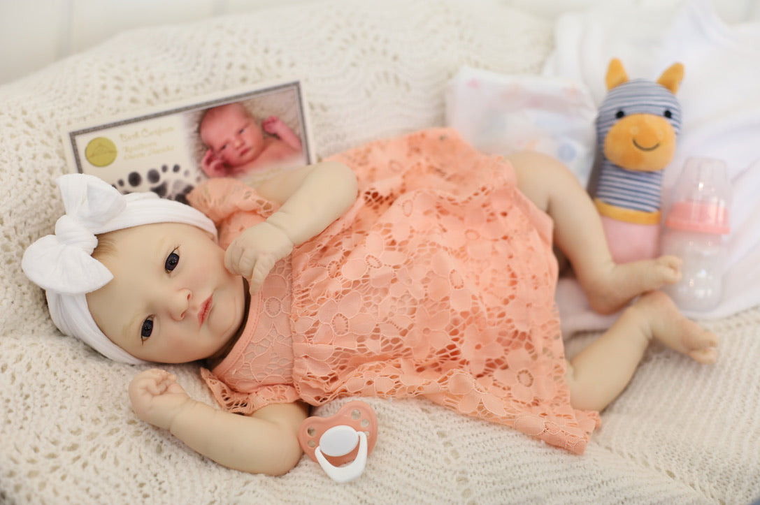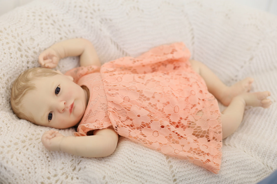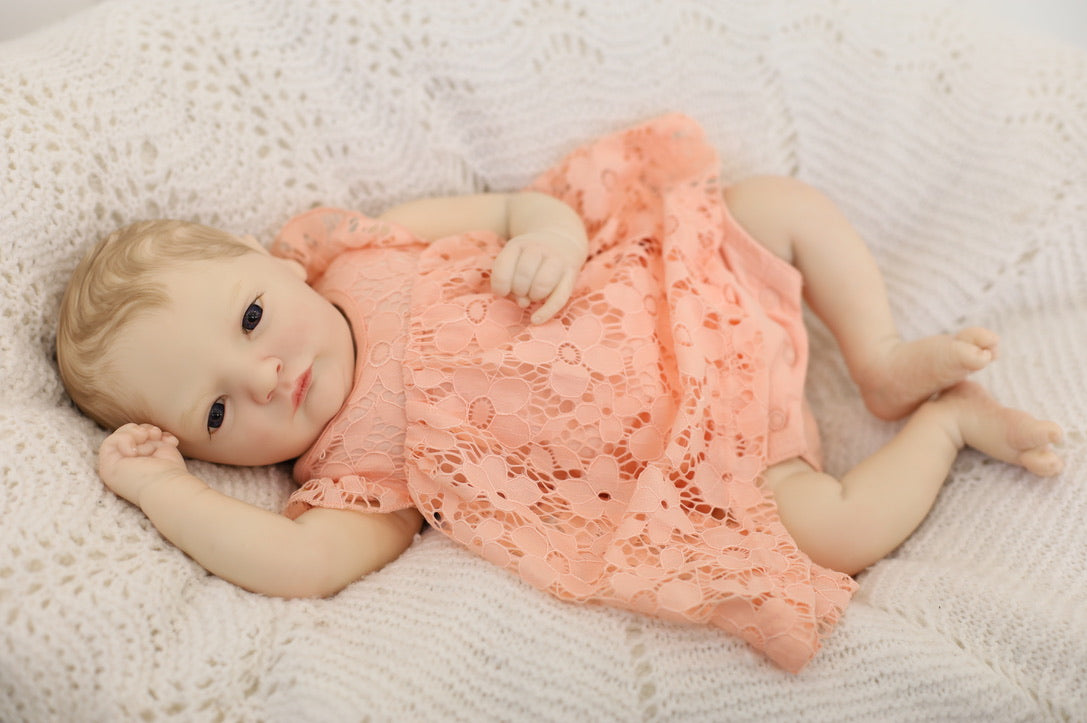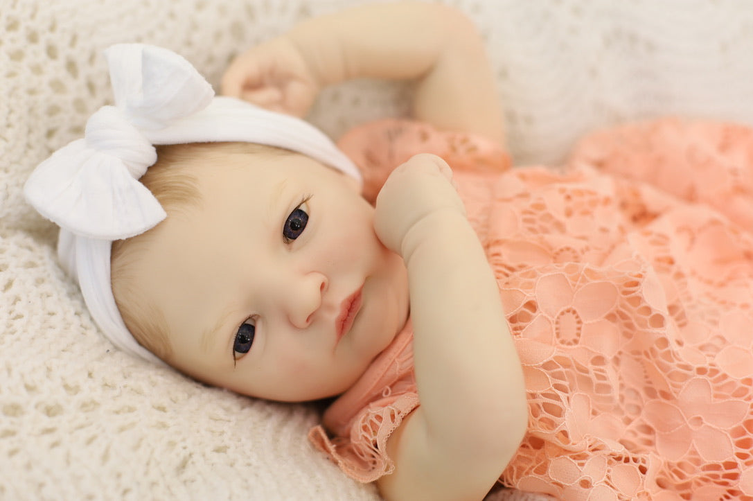 She has been hand painted at Aliyah's Playborn World by our team of talented reborn artists. Many, many layers of paint have brought this precious baby to life, making her look and feel just like a real baby.
