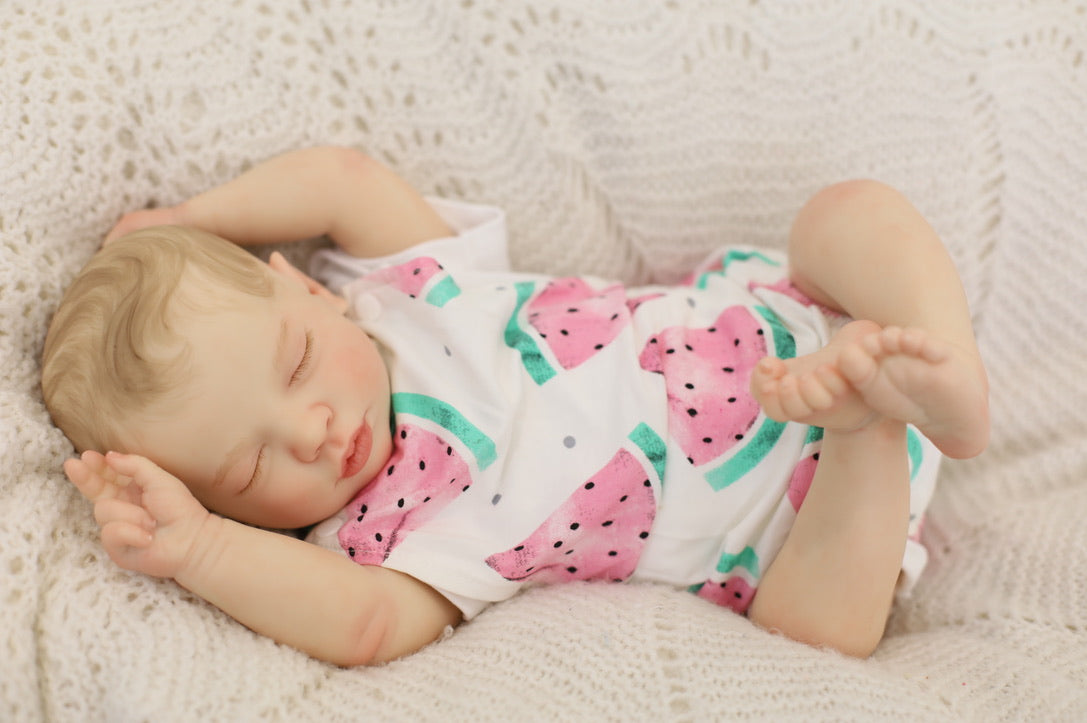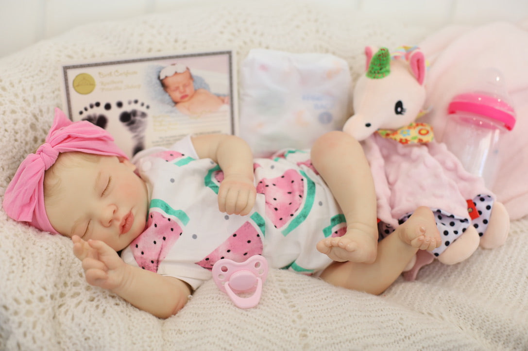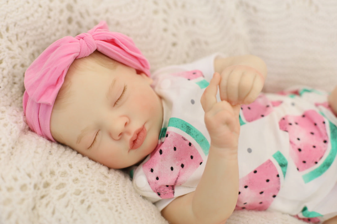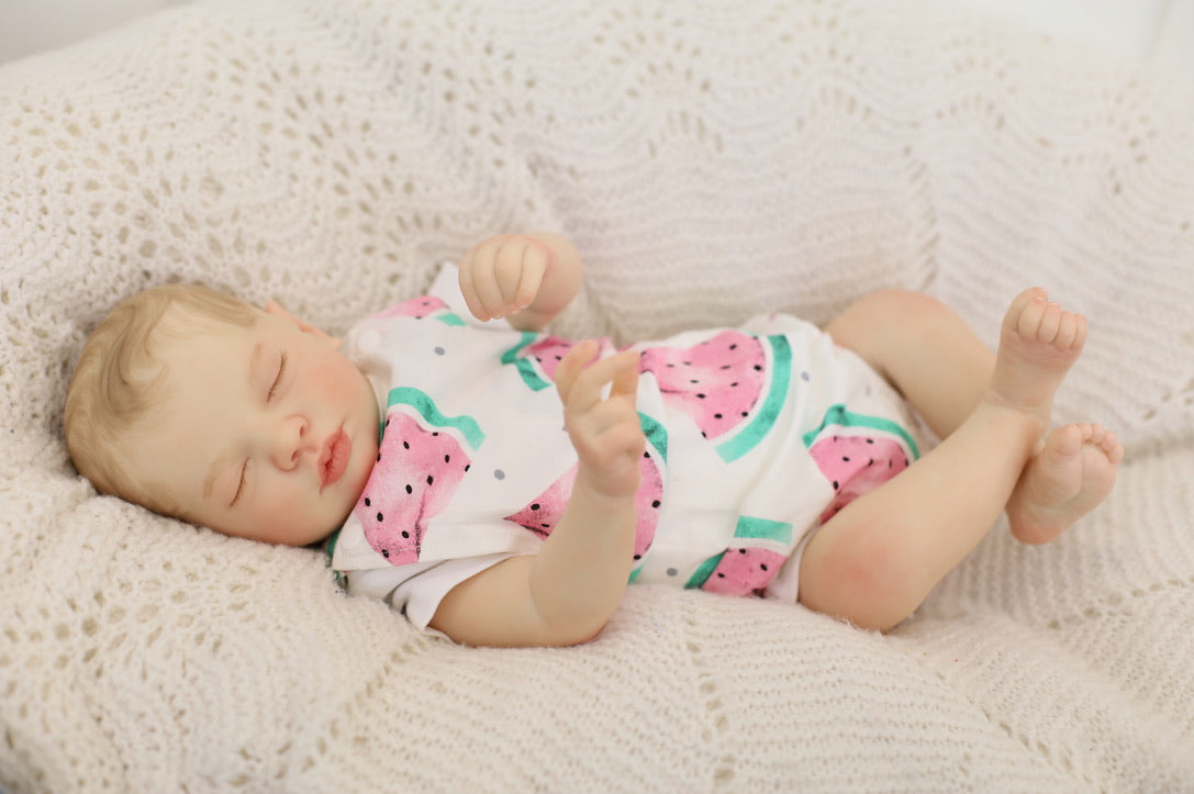 She has been hand painted at Aliyah's Playborn World by our team of talented reborn artists. Many, many layers of paint have brought this precious baby to life, making her look and feel just like a real baby.